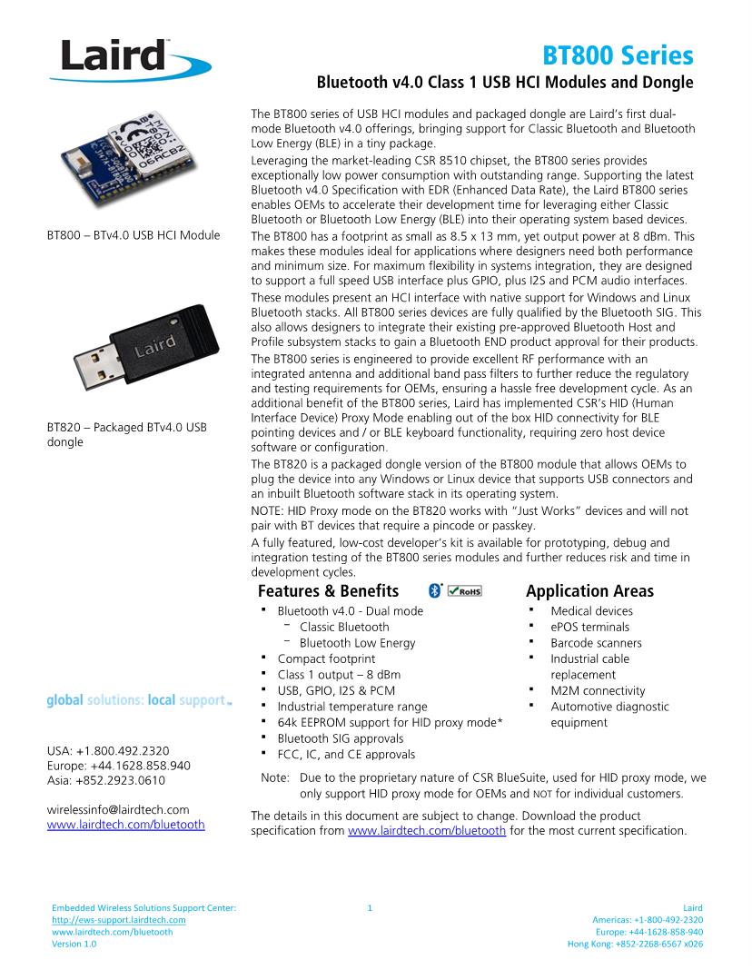 Laird Technologies BT820 USB Dongle Bluetooth Bt800 V4.0 HCI